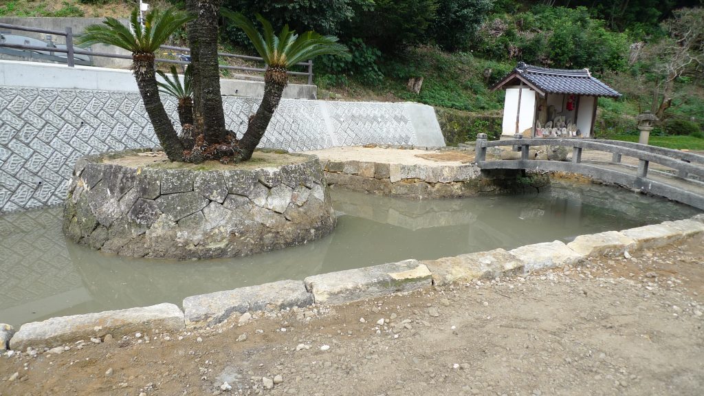 震災からの復興に向けて、工事かいよいよ本格的に始まりました。危険度の高かった池の石垣から着手しております。