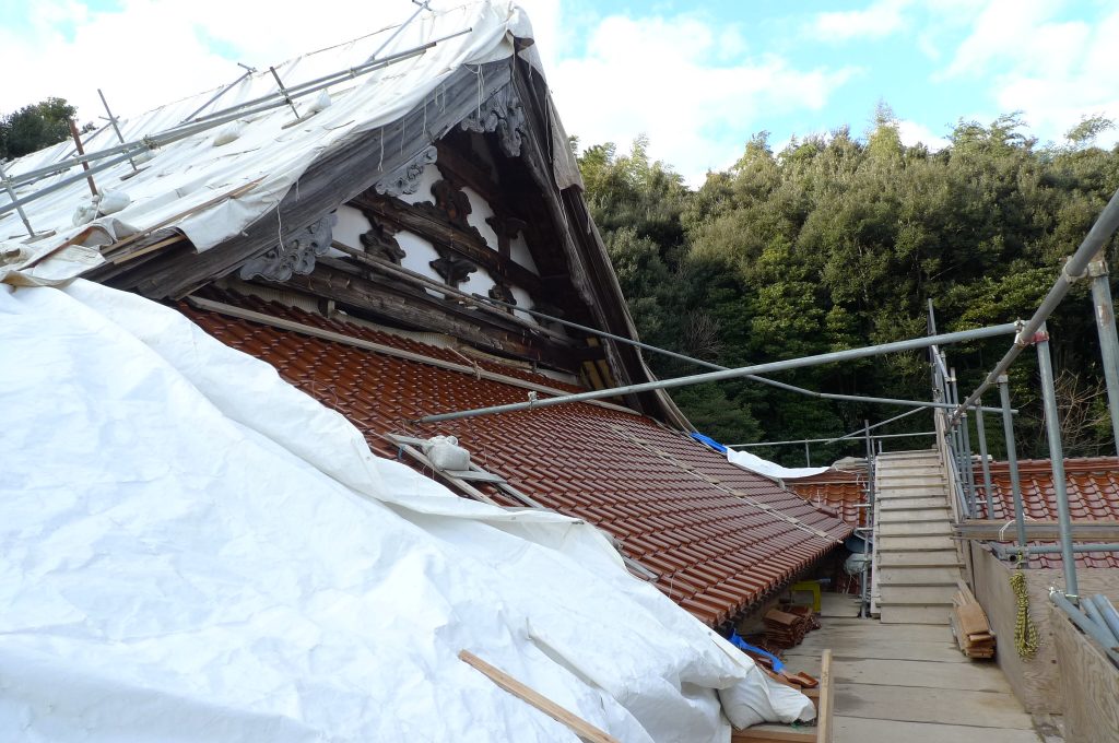 本堂の正面から右側側面の屋根瓦が葺かれました。